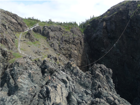 Figure 1. Fractured and weathered rocks below Surgeon Cove Lighthouse. Stairs to lighthouse on the left and hoist rope on the right. The rocks show fracturing and faulting that are a result of the early Paleozoic mountain building in the area (Photo courtesy Marie Iams)