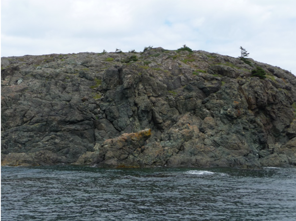 Such weathering is evidenced in the rocks on Exploits Islands in both the fracturing of the rock and in the colour of the rock surfaces. Although the mafic rocks (e.g., basalts) are a dark green when seen on fresh surfaces, the weathered surfaces of the cliffs and shorelines are often a dull sooty grey or a rusty brown in colour. This is due to a weathering process which oxidizes the iron-bearing minerals in the rocks giving rise to a dark or “rusty” iron-oxide coating on the rock surfaces.
